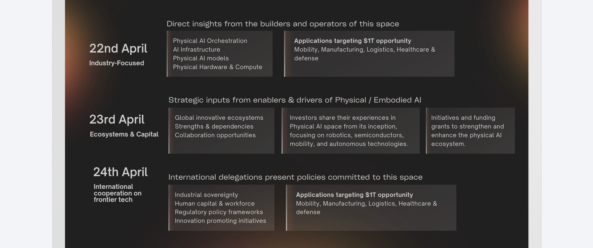 On day 3, select sponsors, partners, and international government reps will discuss Physical AI, focusing on its potential, job creation, workforce transition, market competitiveness, and policies to boost economic resilience and broad prosperity.